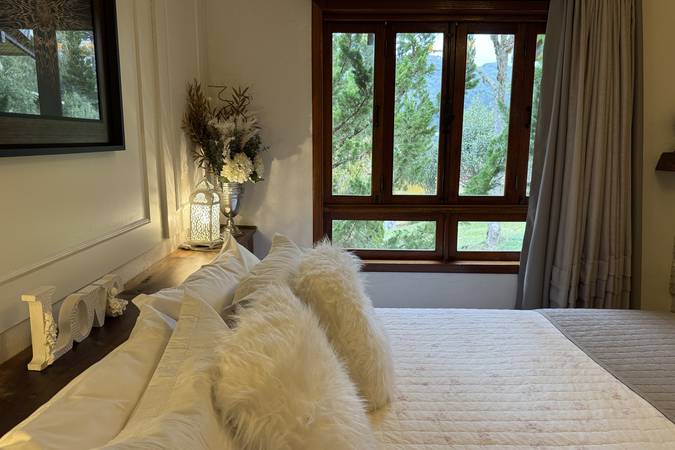 Além do quarto aconchegante com lareira para aquecer os dias frios, há uma sala integrada com sofá, mesa e cadeiras.