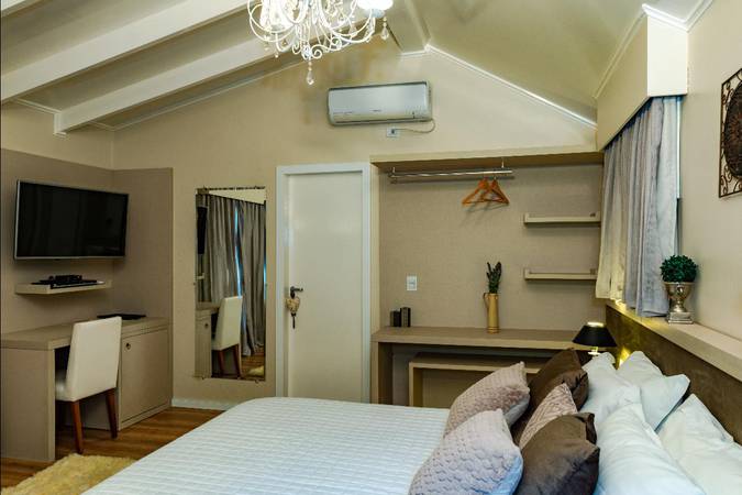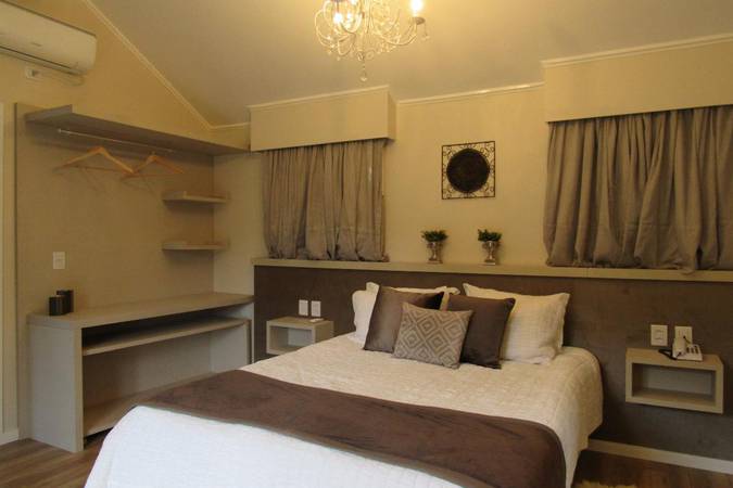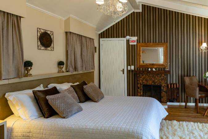 O conforto da cama de casal Queen Size, a sala com lareira a lenha integrada ao ambiente e a banheira de hidromassagem triangular, com vista para o lago deixa qualquer casal apaixonado pelo Chalé e com uma estadia perfeita!