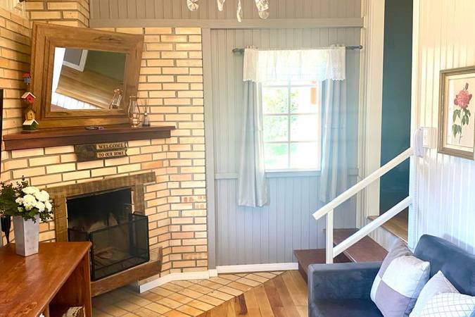 O Chalé Família número 2 conta com 2 quartos independentes, para até 4 pessoas, um com cama Box Queen e outro com 2 camas de solteiro que podem virar uma cama de casal, além de banheiro privativo e sala com sofá e lareira.